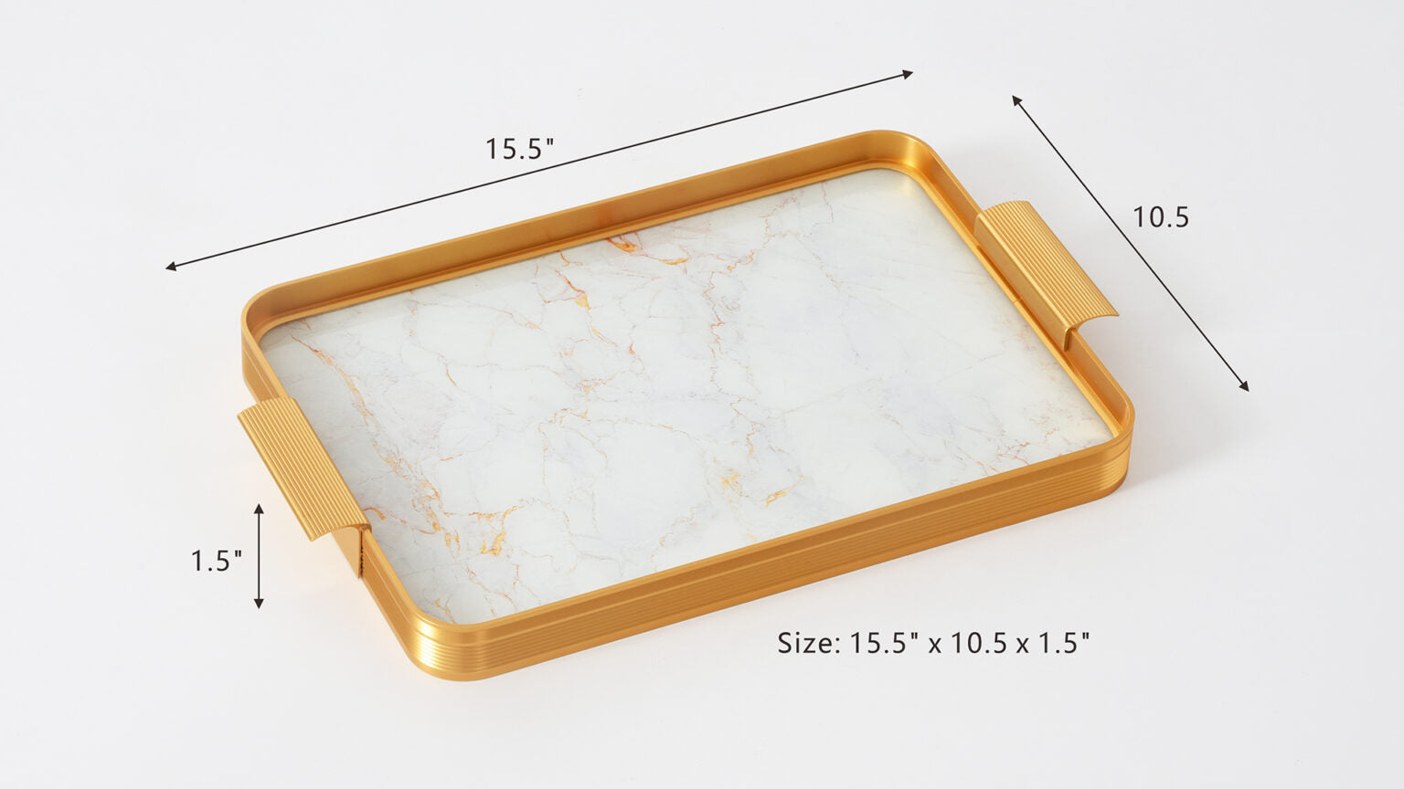 The combination of striking aluminum with glass create the Rectangular Tray from our Tango Collection. Suits all types of tables and is plenty chic for elegant occasions! Perfect for serving side dishes, appetizers, and desserts. Crafted with a stunning and elegant marble design. Hand-wash Only. Beautifully packed in a gift box.
